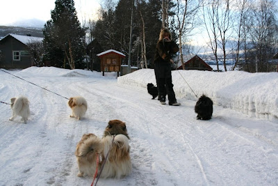 Jeg er faktisk ganske imponert av mine tre små når vi går tur. Det er faktisk ikke et eneste bjeff å høre selv om vi møter folk med staver, andre hunder eller noe annet. Det var faktisk en hund som stod og bjeffet besatt opp i lia når vi gikk forbi, men hundene mine bare så på han og gikk videre. De har selvsagt lyst å hilse på alle de møter, men det er kun hvis andr tar initiativ at jeg lar dem gjøre det. Slik som disse ungene som var på ski. De syntes det var veldig artig å få klappe dem og hundene hadde ingenting i mot det. Når vi gikk hørte jeg de sa til faren "hundene likte oss og de var ikke noen bråkehunder". Da ble jeg litt stolt gitt.