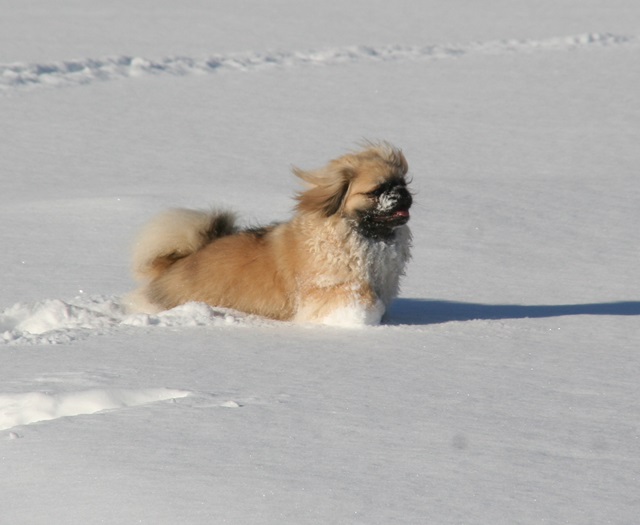 Tilde har masse fin pels, og det er mass snøklumper som fester seg til den. Selv om det er godt over -20 grader om natta, så er det klamt i snøen når sola skinner. Perfekt snøklumpvær :)