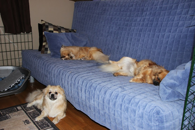 Veldig blå sofa, men det er egentlig greit :) Her sover jeg når jeg har valpekull, så den er praktisk å ha. Også veldig greit å ha ei grind her, for når det er løpetid må jeg skille hannene og tispene.